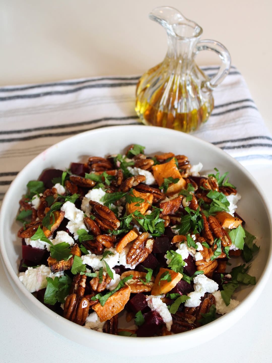 Salade d’automne betterave, patate douce, fromage de chèvre et pacanes caramélisées
