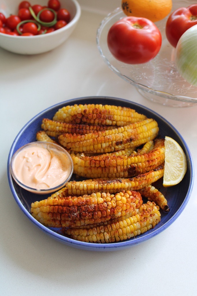 Dès que les quartiers de maïs sont sortis du four, ajouter un filet de jus de citron frais. Dégustez-les immédiatement en les plongeant dans la sauce épicée qui a été mise à côté.